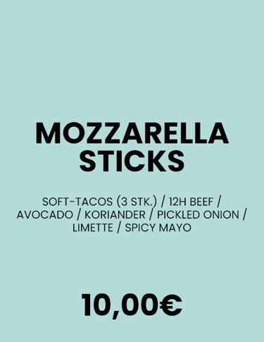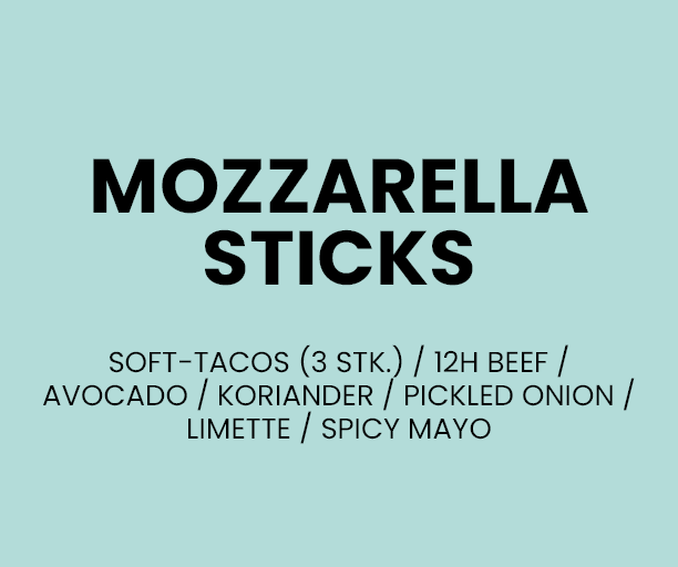 CHICKEN CHIPS / MOZZARELLA STICKS / RED HOT CHILI POPPERS / ZWIEBELRINGE / POTATO WEDGES / HUMMUS / OLIVENMIX / INGWER-HONIG-SAUCE / BBQ-SAUCE / SOUR CREAM